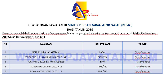 Jawatan Kosong Di Majlis Perbandaran Alor Gajah Mpag Kelayakan Pmr Spm Diploma Ijazah Ejawatankini Com